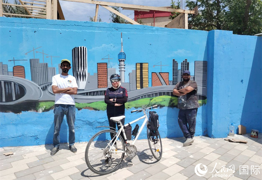 一位街頭騎行者和藝術(shù)家在壁畫墻前合影。人民網(wǎng) 伊納斯·易卜拉欣攝