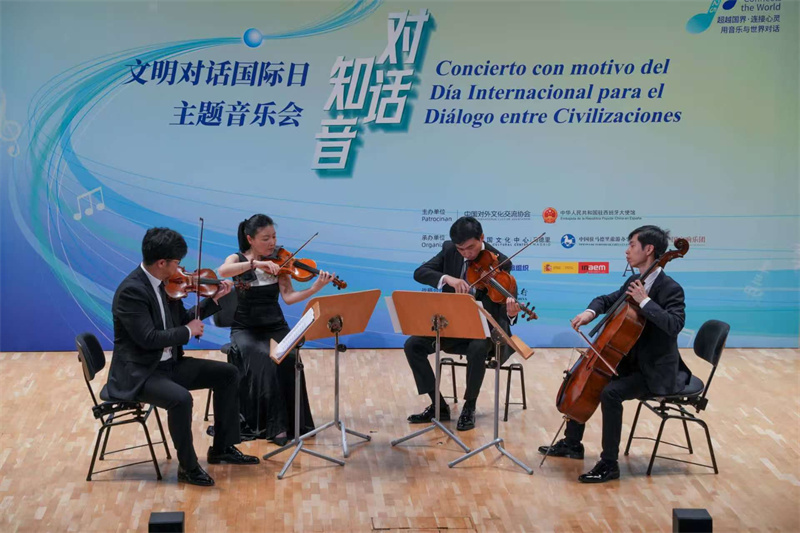 音樂會(huì)由中國(guó)交響樂團(tuán)紫禁城弦樂四重奏傾情演繹。為體現(xiàn)文明交流互鑒的初衷,精心設(shè)計(jì)的曲目涵蓋中國(guó)傳統(tǒng)樂曲和西方經(jīng)典作品,從旋律昂揚(yáng)的《金蛇狂舞》、清新優(yōu)雅的《茉莉花》、氣勢(shì)磅礴的《賽馬》到婉轉(zhuǎn)悠揚(yáng)的貝多芬c小調(diào)第四號(hào)弦樂四重奏,在時(shí)而激蕩、時(shí)而細(xì)膩的旋律聲中,觀眾們仿佛穿梭于中華風(fēng)韻與西方古典之間,沉浸于多元文明交匯融合的藝術(shù)境界。音樂廳內(nèi)氣氛熱烈、掌聲雷動(dòng),許多西班牙觀眾表示,音樂的感染力沒有國(guó)界,中國(guó)傳統(tǒng)音樂所展現(xiàn)出的文化底蘊(yùn)和情感共鳴令人震撼與感動(dòng)。