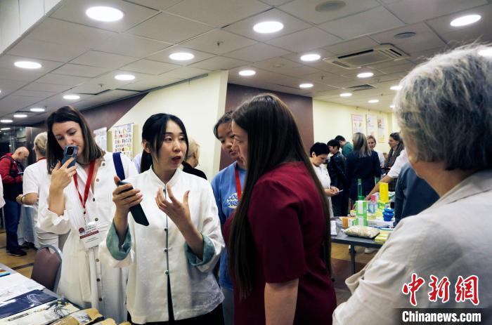 當(dāng)?shù)貢r間6月14日,第二屆“一帶一路”中醫(yī)藥國際論壇(2025俄羅斯)在莫斯科開幕。圖為俄羅斯民眾現(xiàn)場咨詢中醫(yī)特色療法。(中新網(wǎng)記者 田冰 攝)