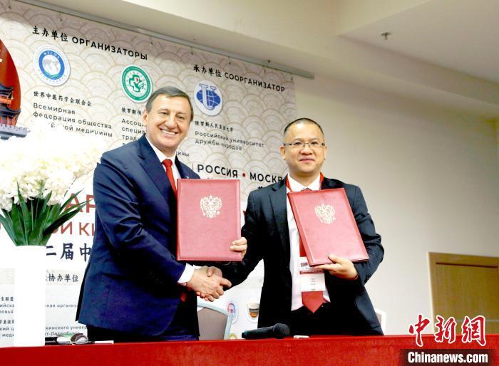 當(dāng)?shù)貢r間6月14日,第二屆“一帶一路”中醫(yī)藥國際論壇(2025俄羅斯)在莫斯科開幕。圖為論壇期間俄羅斯傳統(tǒng)東方醫(yī)學(xué)專家學(xué)會與俄羅斯“國家健康聯(lián)盟”簽署合作協(xié)議。(中新網(wǎng)記者 田冰 攝)