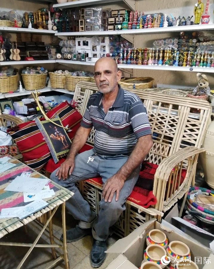 阿布·阿巴斯在經(jīng)營的手工藝品店里。人民網(wǎng) 伊納斯·易卜拉欣攝