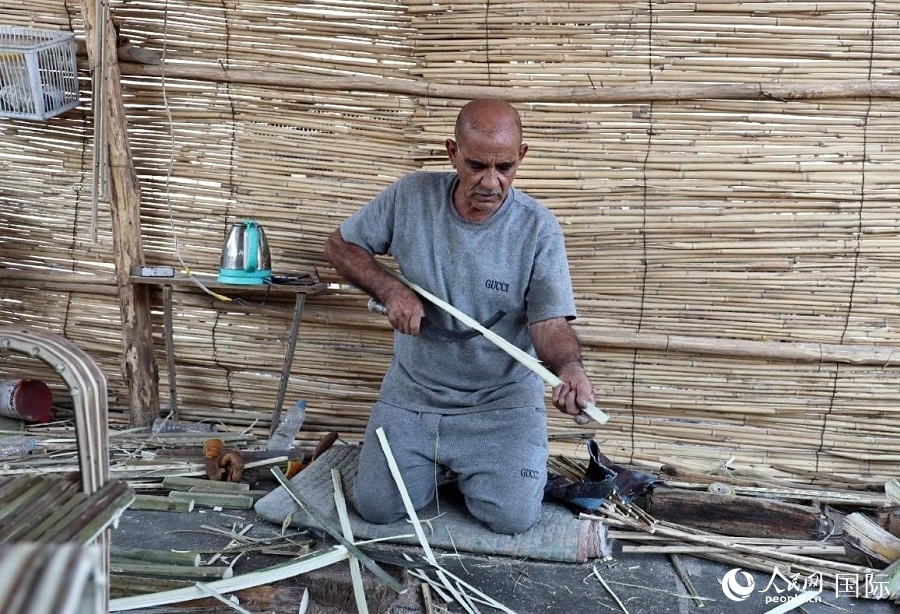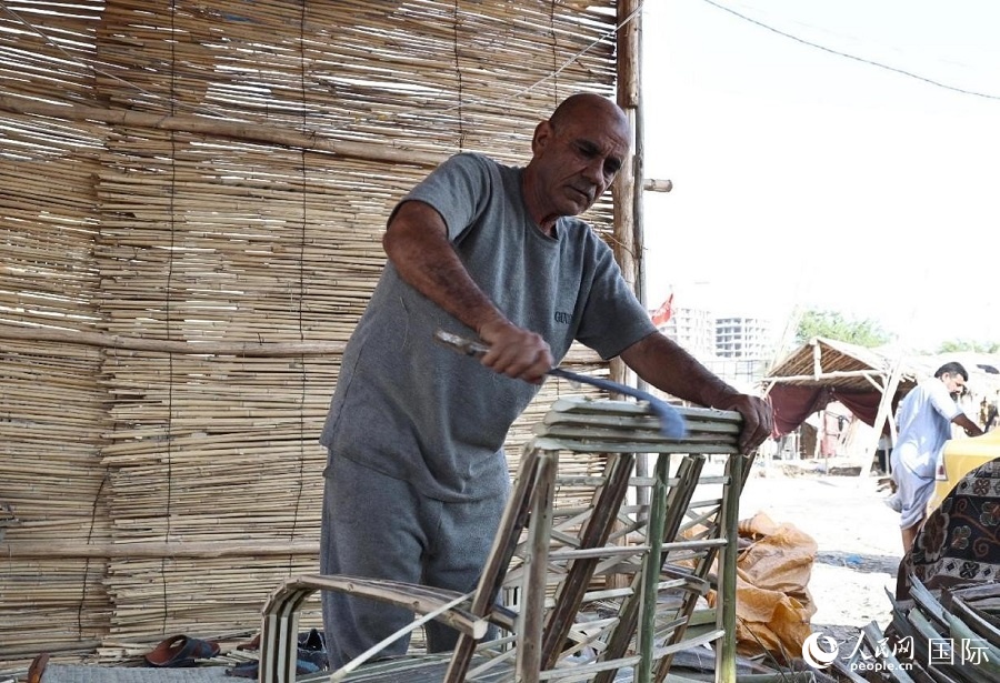 阿布·阿巴斯就是這樣一位手藝人。他說,在巴格達(dá)的老巴扎,曾經(jīng)云集了數(shù)十家棕櫚木家具店,但隨著工業(yè)化發(fā)展,像他這樣還在手工制作棕櫚木桌椅的人掰著手指都數(shù)得過來。只見一把柴刀在手,阿布·阿巴斯嫻熟地把一根棕櫚桿削成木條,釘在框架上做成了椅子靠背。終而復(fù)始,很快一把椅子就做成了。