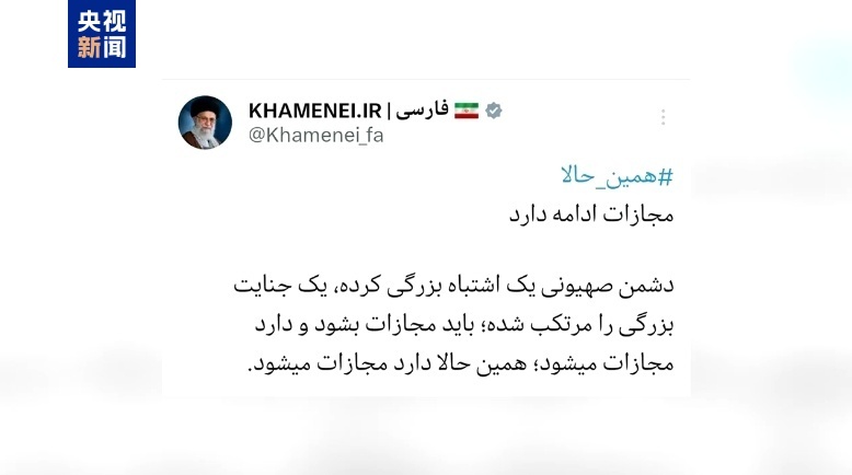 當(dāng)?shù)貢r間23日凌晨,伊朗最高領(lǐng)袖哈梅內(nèi)伊在社交媒體上表示,以色列犯下了巨大的錯誤和罪行,必須受到懲罰,且正在受到懲罰。