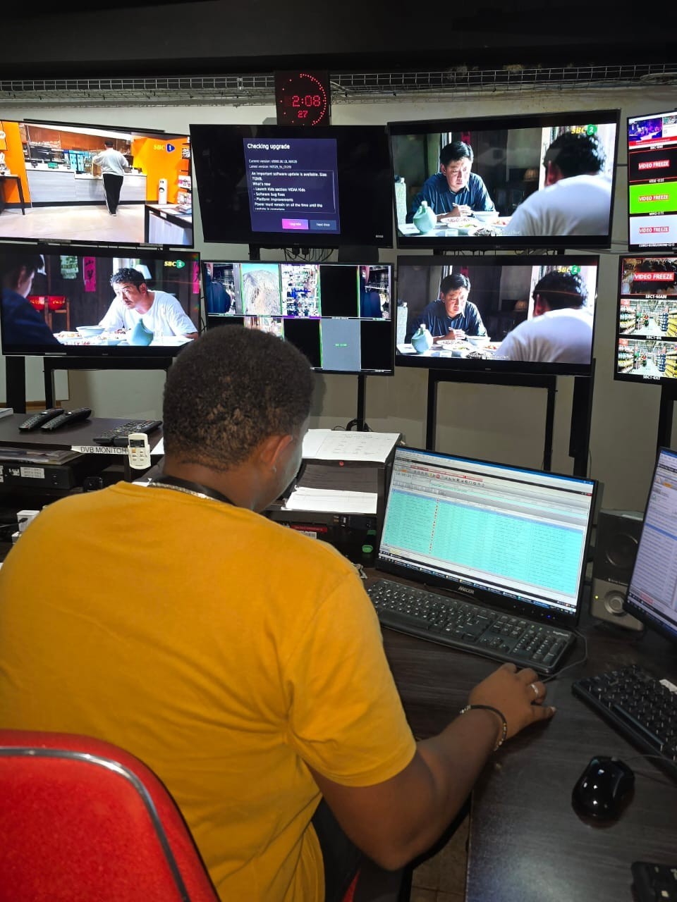 塞舌爾廣播電視臺(tái)工作人員在播放中國電視劇《大江大河》。中國駐塞舌爾大使館供圖