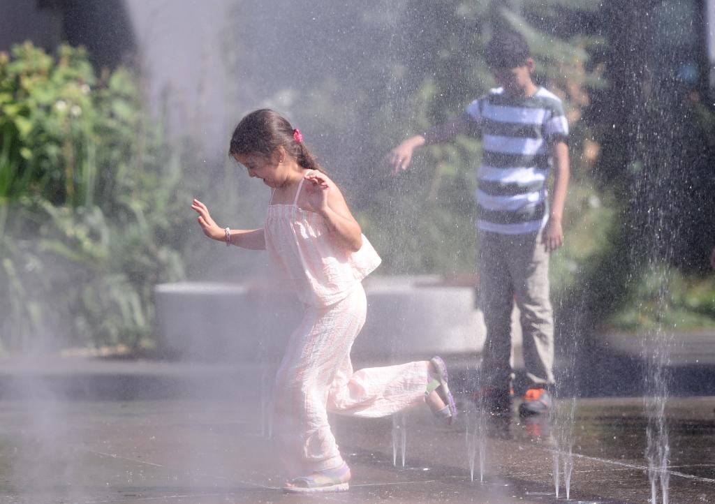 7月3日,在奧地利維也納,孩子們在一處噴泉裝置旁玩耍。(新華社記者賀燦鈴攝)