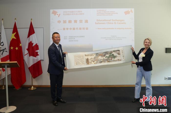 當(dāng)?shù)貢r(shí)間7月4日,加拿大多倫多,在中國駐多倫多總領(lǐng)館與加拿大約克大學(xué)聯(lián)合舉辦的“中加教育交流——留學(xué)中國代際對話”活動(dòng)中,中國駐多倫多總領(lǐng)事羅偉東(左)向約克大學(xué)教務(wù)長、學(xué)術(shù)副校長麗莎·菲利普斯贈(zèng)送《清明上河圖》(局部圖)。 中新社記者 余瑞冬 攝