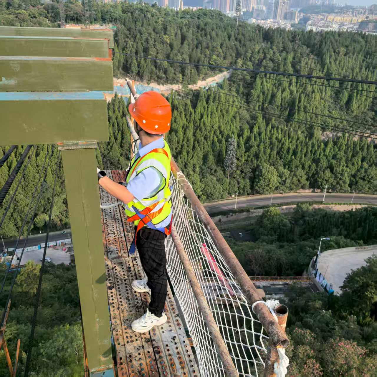 荊門分院——象山與雨山之間的“兩山”廊橋項目,檢驗人員為纜索式起重機做檢驗,為這座連接山水的橋筑牢“安全根基。