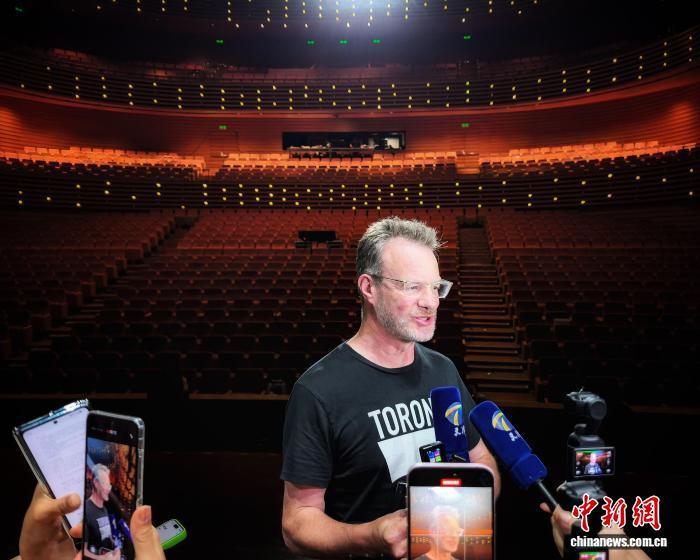 8月8日晚,在話劇《肖申克的救贖》中飾演瑞德的加拿大演員大山(Mark Rowswell)在天津大劇院接受媒體采訪。中新社記者佟郁攝