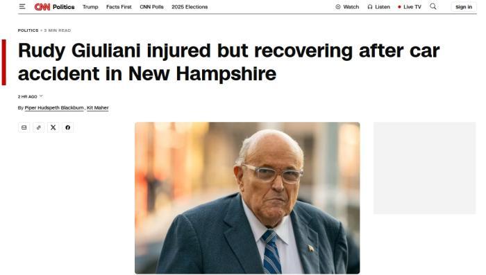 據(jù)報道,朱利安尼的發(fā)言人拉古薩在社交媒體上發(fā)布聲明稱,當?shù)貢r間8月30日晚,朱利安尼乘坐的車輛遭后方車輛“高速撞擊”,隨后他被送往附近的創(chuàng)傷中心接受治療,“在那里他被診斷出胸椎骨折、多處撕裂傷和挫傷,以及左臂和小腿受傷”。