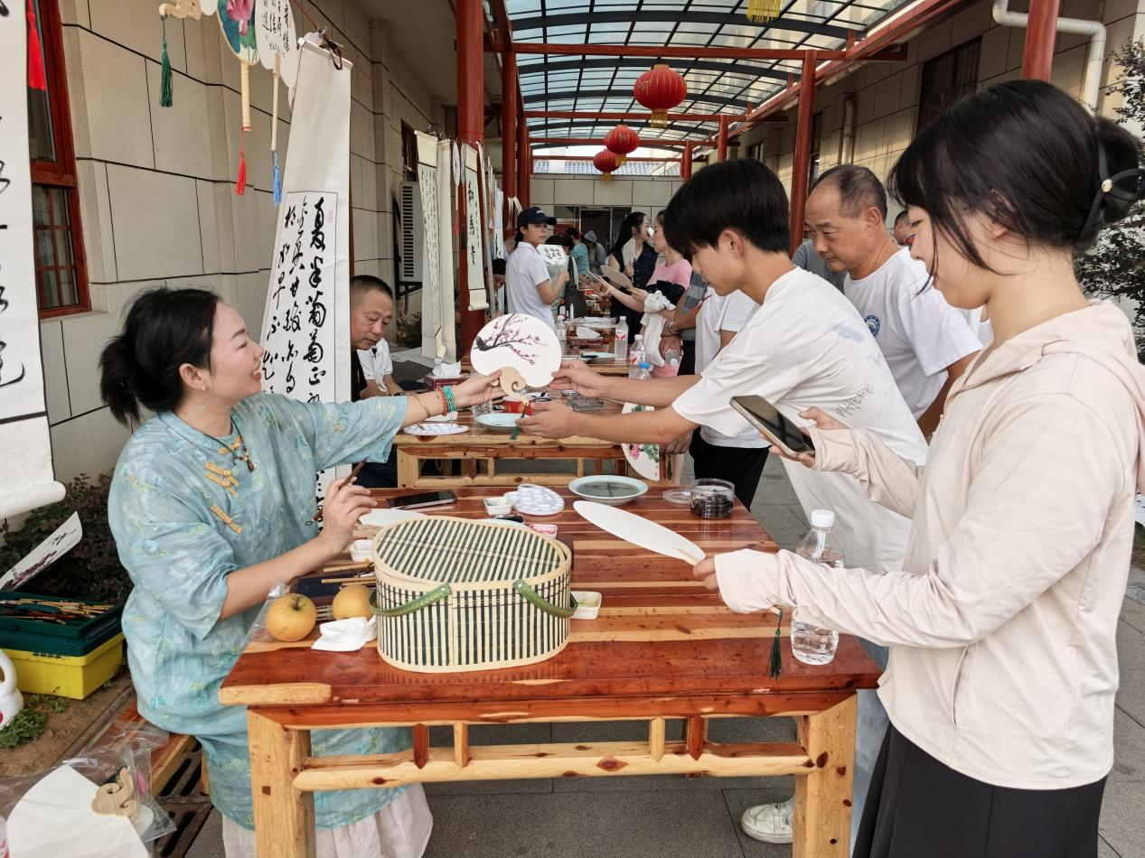 采摘季的熱鬧,不止在葡萄架下。園區(qū)內(nèi)的文化活動(dòng)區(qū),扇子繪畫與書法桌前圍滿了人。老師們凝神揮毫,有的在扇面勾勒黛色遠(yuǎn)山、粉紅梅花,有的書寫“喜樂安康”“清風(fēng)徐來”,圍觀群眾有序排隊(duì),盼著領(lǐng)走專屬自己的“文化伴手禮”。