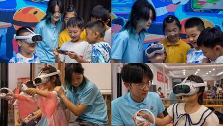 實(shí)踐隊(duì)引入VR技術(shù)開展體育活動(dòng),孩子們戴上VR眼鏡后,可在虛擬場(chǎng)景中體驗(yàn)籃球、羽毛球等運(yùn)動(dòng),電子軌跡與虛擬星空讓體育活動(dòng)突破場(chǎng)地限制。隊(duì)員們?cè)谂允刈o(hù),確保孩子們?cè)谔搶?shí)結(jié)合的環(huán)境中安全奔跑、跳躍,額角的汗珠與興奮的呼喊,讓孩子們?cè)谌の吨懈惺苓\(yùn)動(dòng)的魅力,實(shí)現(xiàn)運(yùn)動(dòng)形式創(chuàng)新化、虛擬化、趣味化。