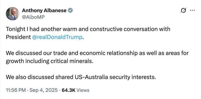 阿爾巴尼斯在社交媒體上發(fā)文稱(chēng),他與特朗普又一次進(jìn)行了“熱情而富有建設(shè)性”的對(duì)話。雙方討論了經(jīng)貿(mào)關(guān)系、關(guān)鍵礦產(chǎn)等合作領(lǐng)域以及美澳共同安全利益等問(wèn)題。