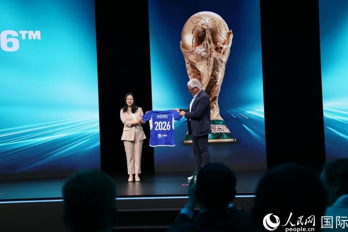 圖為國際足聯(lián)首席商務官羅米·蓋伊向海信代表贈送2026世界杯紀念品。人民網(wǎng)記者 劉仲華攝