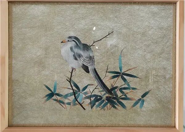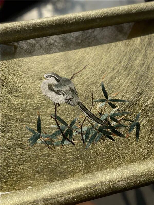 2019年,劉小紅創(chuàng)新研發(fā)“云絲紙刺繡”項目。材質(zhì)上,選用纖維絲壓制的云絲紙作底料,這種紙張紋理稀薄無序、疏密不均,在常規(guī)刺繡中難以固定針腳,本不適用于繡制。針法上,針對云絲紙?zhí)匦裕捎谩按顦驙烤€”復(fù)合手法:先以“線中生線”的方式在紙材稀薄處用長針固定,再以“針中套針”的技法在紙材密實處維穩(wěn);表現(xiàn)層面,則依據(jù)圖案需求,通過絲線分絲的粗細變化與顏色疊變呈現(xiàn)質(zhì)感,最終讓作品與云絲紙的特質(zhì)完美融合,呈現(xiàn)出精妙絕倫的藝術(shù)效果。