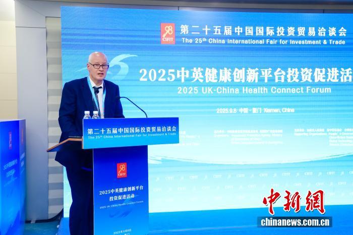 英國駐華大使魏磊(Peter Wilson)9月8日在廈門舉行的2025中英健康創(chuàng)新平臺投資促進(jìn)活動致辭。第二十五屆中國國際投資貿(mào)易洽談會組委會 供圖