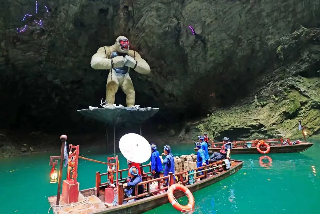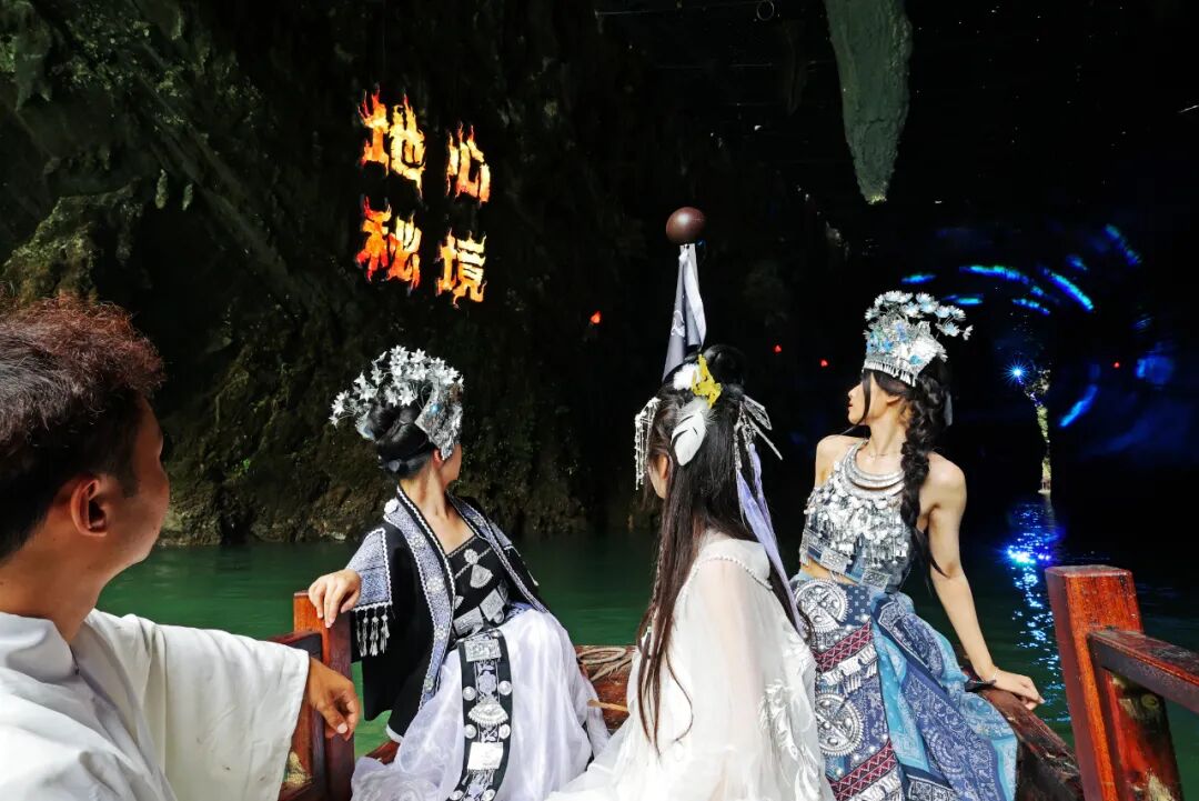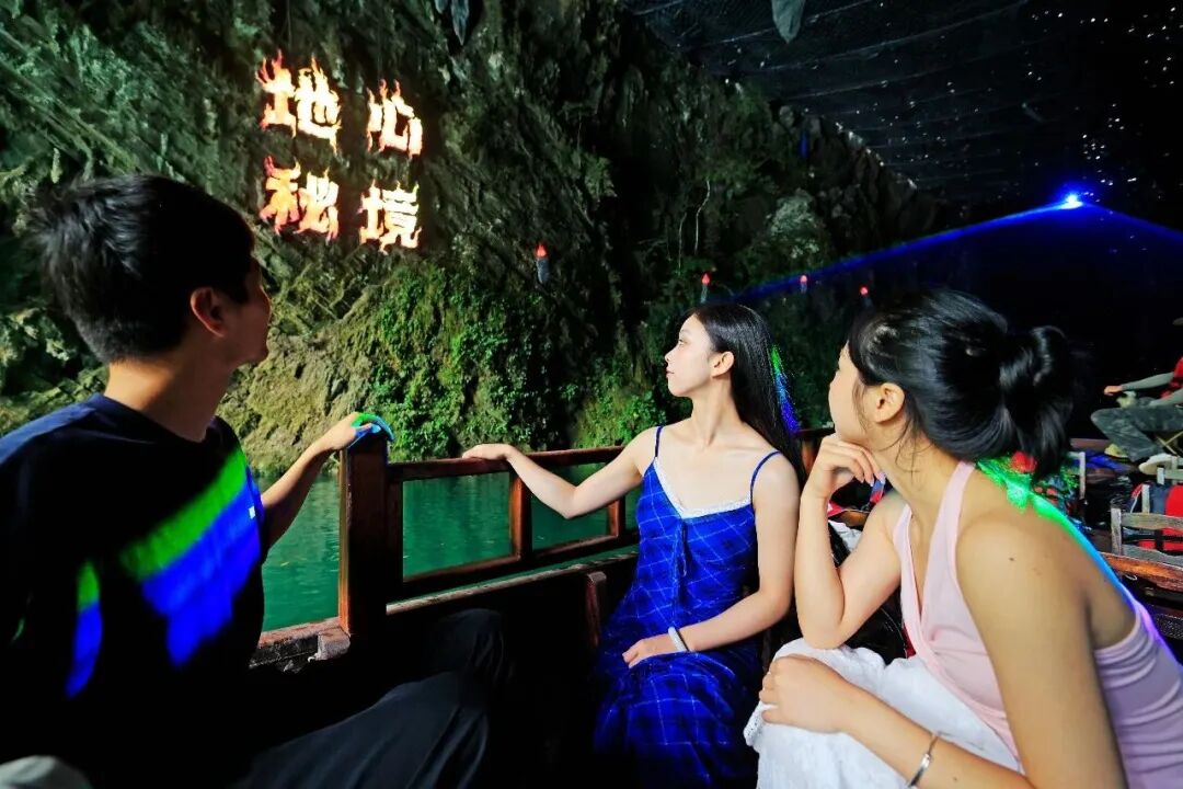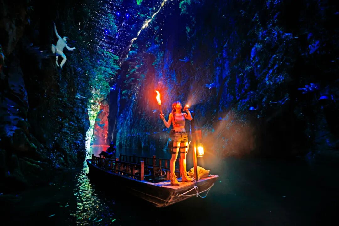 船只駛?cè)胗纳畹牡叵潞拥溃瑳鏊瑲庀涿娑鴣?lái)。七彩燈光投射在千年崖壁上,打造出如夢(mèng)似幻的氛圍。在蜿蜒曲折的地下迷宮中穿行,每一次轉(zhuǎn)彎都可能遇見震撼的地質(zhì)奇觀。