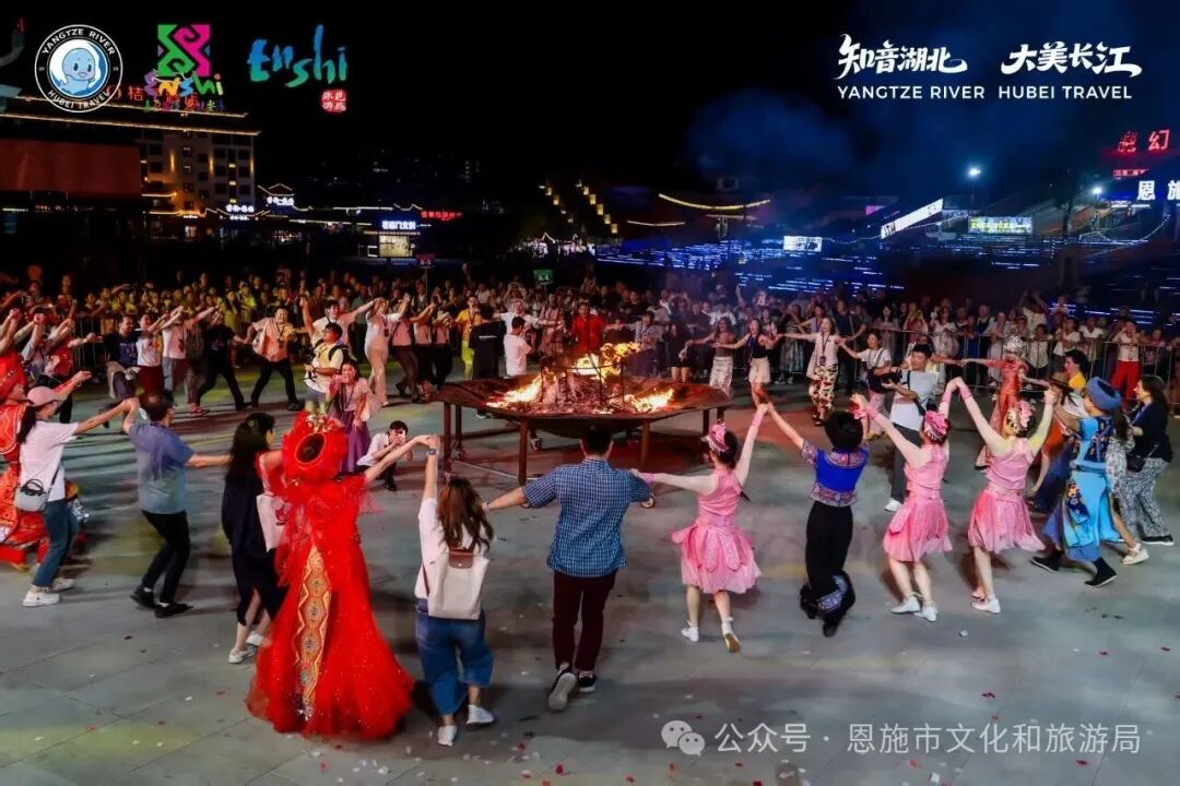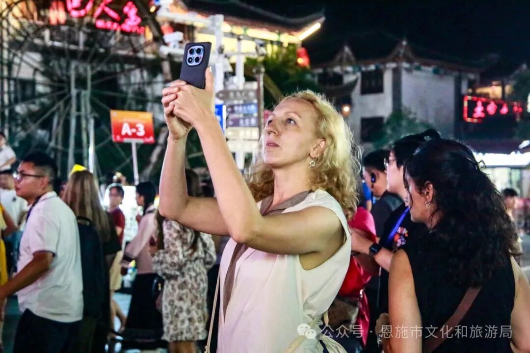 來(lái)到恩施市的首站,旅行商團(tuán)隊(duì)走進(jìn)恩施女兒城。通過(guò)古色古香的吊腳樓群、原汁原味的民俗表演和互動(dòng)體驗(yàn),讓外賓們直呼“穿越時(shí)空”。圍著篝火跳完擺手舞,來(lái)自俄羅斯的代表興奮地表示:“傳統(tǒng)舞蹈的韻律和熱情極具感染力,這種活態(tài)文化傳承比博物館展示更令人難忘!”
