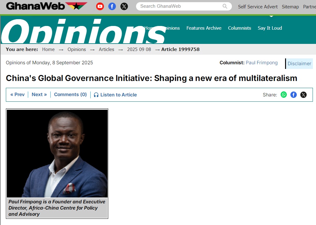 中國(guó)日?qǐng)?bào)網(wǎng)9月12日電 加納新聞網(wǎng)站“Ghana Web”9月8日刊發(fā)加納非中政策咨詢中心執(zhí)行主任保羅·弗林蓬的署名文章《中國(guó)全球治理倡議:塑造多邊主義新時(shí)代》,對(duì)中國(guó)提出的全球治理倡議予以高度評(píng)價(jià)。