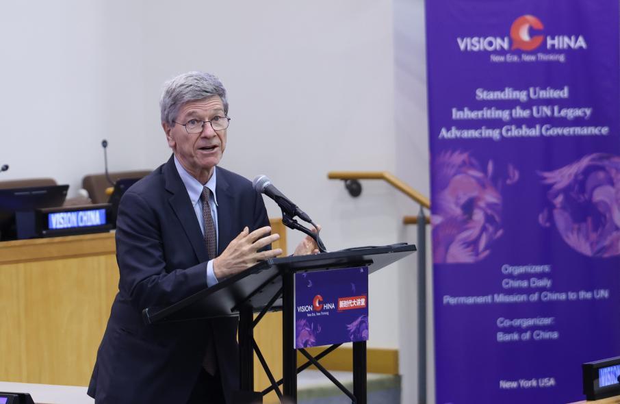 哥倫比亞大學可持續(xù)發(fā)展中心主任、教授杰弗里·薩克斯發(fā)表演講。中國日報記者 馮永斌 攝