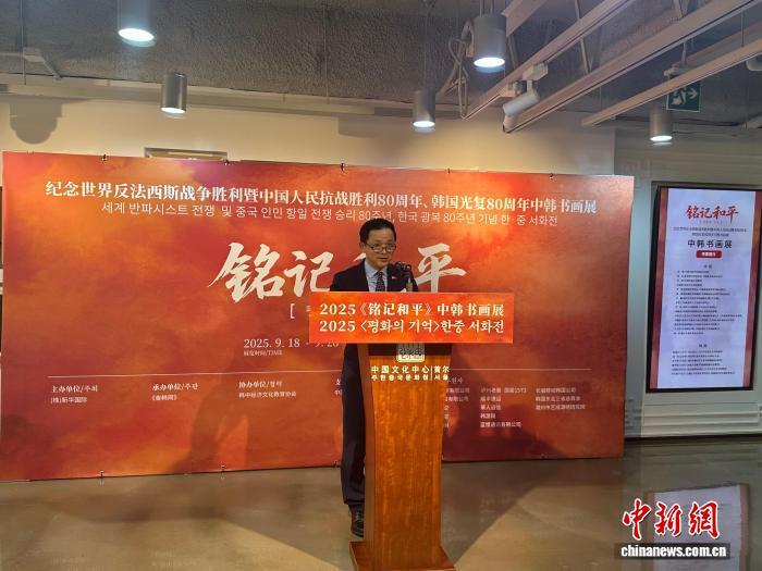 9月18日,《銘記和平——紀(jì)念世界反法西斯戰(zhàn)爭(zhēng)暨中國人民抗戰(zhàn)勝利80周年、韓國光復(fù)80周年中韓書畫展》在首爾中國文化中心開幕。圖為中國駐韓國大使戴兵致辭。姜春雨 攝