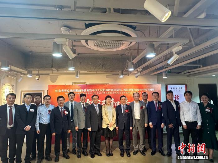9月18日,《銘記和平——紀(jì)念世界反法西斯戰(zhàn)爭(zhēng)暨中國人民抗戰(zhàn)勝利80周年、韓國光復(fù)80周年中韓書畫展》在首爾中國文化中心開幕。圖為活動(dòng)合影。姜春雨 攝