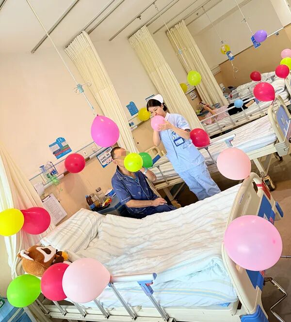 跟著這個方法練習,楊叔叔的進步肉眼可見:從一開始只能吹鼓小半只氣球,到后來能連續(xù)吹完兩三只;從吹氣球時會忍不住咳嗽,到胸口的緊繃感越來越輕,甚至能自己繞著病房走兩圈。如今,走進楊叔叔的病房,粉、紫、綠、紅的氣球隨處可見,成了病房里最亮眼的裝飾?!澳憧?,這都是我這幾天吹的,每個護士進來都會說好看,隔壁床病友也覺得好看!” 楊叔叔說起這些氣球,語氣里滿是自豪。