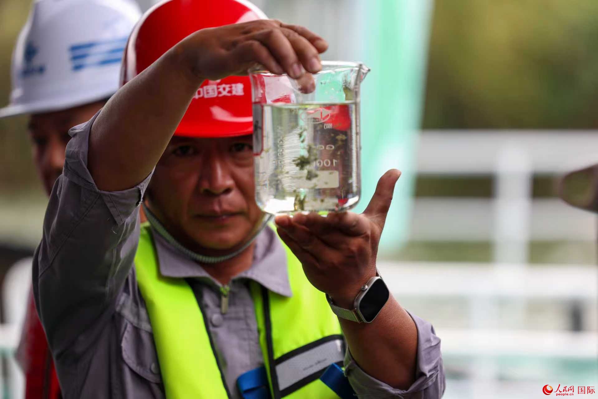 工作人員向2025“一帶一路”媒體合作論壇中外媒體聯(lián)合采訪團(tuán)展示藍(lán)藻從水中分離的技術(shù)。人民網(wǎng)記者 張武軍攝