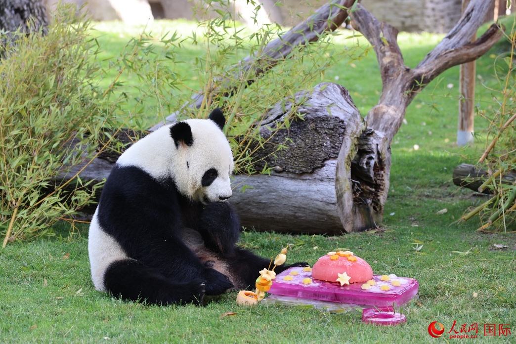 圖為大熊貓享用自己的“生日大餐”。人民網(wǎng)記者 許海林?jǐn)z