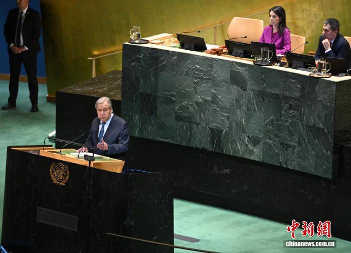 當(dāng)?shù)貢r間9月23日,紐約聯(lián)合國總部,第80屆聯(lián)合國大會一般性辯論開幕。圖為聯(lián)合國秘書長古特雷斯在開幕式上致辭?!≈行律缬浾?陳孟統(tǒng) 攝