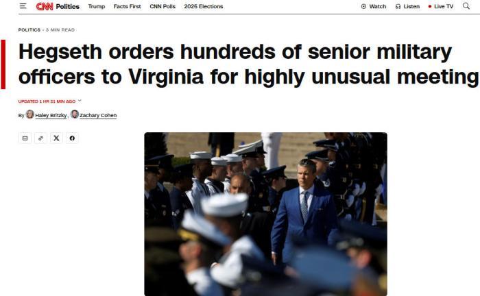 據(jù)CNN報道,數(shù)百名美國高級軍官將于9月30日與赫格塞思舉行會議,會議預(yù)計(jì)將在弗吉尼亞州的一個軍事基地舉行。