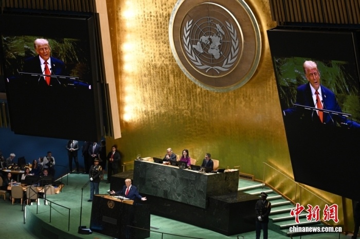 當?shù)貢r間9月23日,紐約聯(lián)合國總部,第80屆聯(lián)合國大會一般性辯論開幕。圖為美國總統(tǒng)特朗普發(fā)言。中新社記者 陳孟統(tǒng) 攝