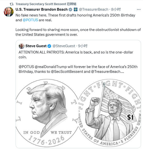 美國財政部官員布蘭登·比奇在社交媒體上回應(yīng)了這一消息,并稱“這不是假新聞。這些紀(jì)念美國建國250周年的首批初稿是真的。”比奇還寫道,一旦美國政府“關(guān)門”事件結(jié)束,他期待能盡快分享更多相關(guān)信息。