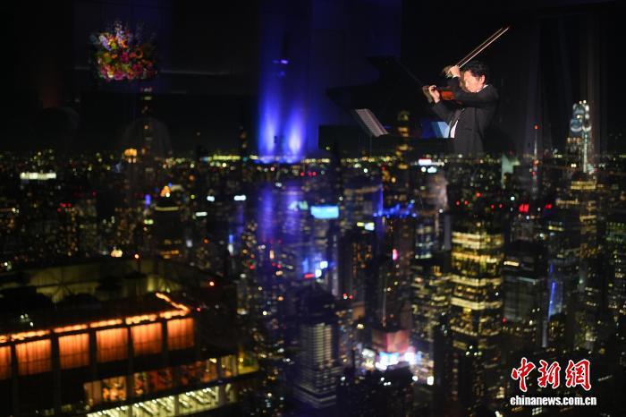 當?shù)貢r間10月6日,美國紐約340米高空奏響“聽月雅集”中秋音樂會。圖為玻璃窗的曼哈頓夜景中倒映著正在演奏樂曲的著名小提琴演奏家呂思清。 中新社記者 廖攀 攝