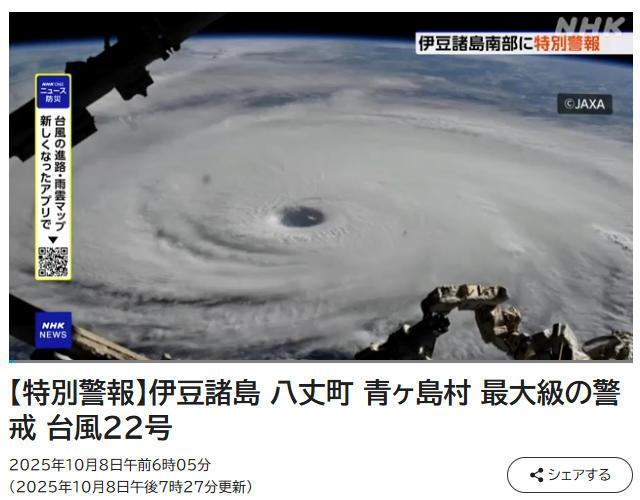 中新網10月8日電 據日本廣播協(xié)會(NHK)報道,2025年第22號臺風“夏浪”將于當地時間9日凌晨至早晨接近日本伊豆群島,日本氣象廳已發(fā)布暴風與巨浪的特別警報,指出當地可能出現數十年一遇的大規(guī)模災害。