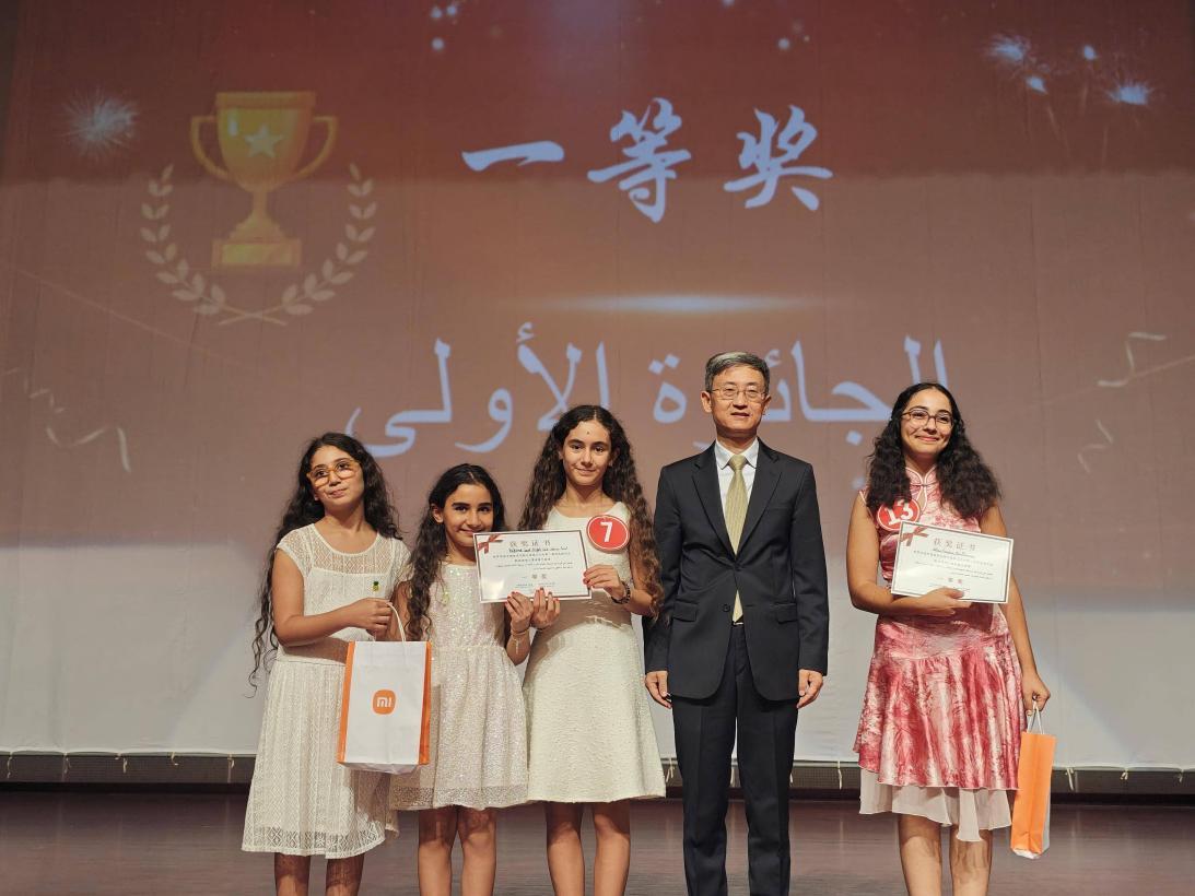中國(guó)駐突尼斯大使萬(wàn)黎為一等獎(jiǎng)獲得者頒獎(jiǎng)。迦太基大學(xué)孔院供圖
