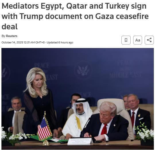 中新網(wǎng)10月14日電 據(jù)路透社報道,當(dāng)?shù)貢r間13日,美國總統(tǒng)特朗普在埃及沙姆沙伊赫,與埃及、卡塔爾和土耳其三國領(lǐng)導(dǎo)人共同簽署了關(guān)于加沙?;饏f(xié)議的文件。