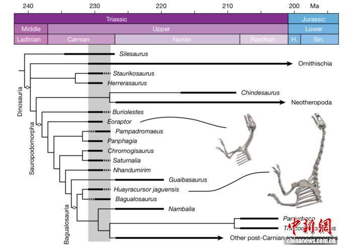 該論文介紹,晚三疊世(約2.37億-2.01億年前)的生態(tài)系統(tǒng)發(fā)生了急劇變化,導(dǎo)致恐龍、哺乳動物的早期近親以及包括鱷魚在內(nèi)的動物種群崛起和分化??铸?jiān)缙谘莼脑S多證據(jù)都發(fā)現(xiàn)于南美,大部分關(guān)鍵發(fā)現(xiàn)局限于阿根廷和巴西的兩個(gè)盆地地區(qū)。