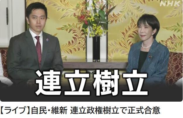 中新網(wǎng)10月20日電 據(jù)日本廣播協(xié)會(NHK)報道,當(dāng)?shù)貢r間20日,日本自民黨總裁高市早苗與日本維新會代表吉村洋文舉行兩黨黨首會談,雙方簽署了關(guān)于兩黨聯(lián)合執(zhí)政的協(xié)議文件,正式確立聯(lián)合執(zhí)政。