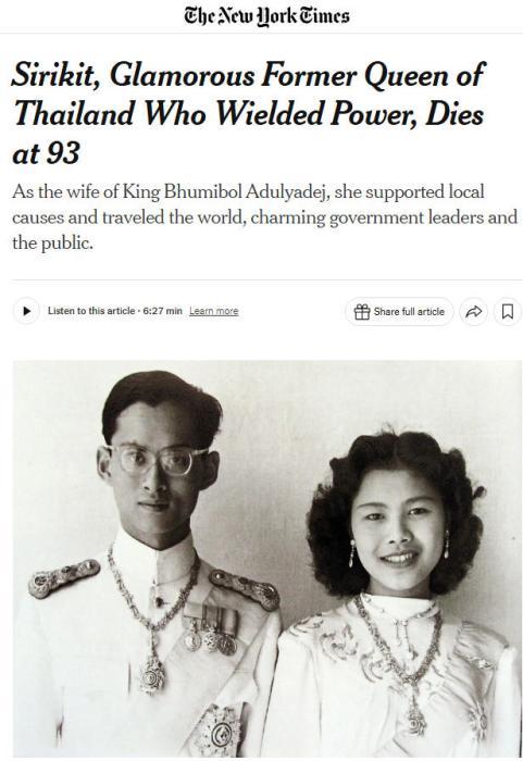 中新網(wǎng)10月25日電 據(jù)美國《紐約時報》、路透社等多家媒體報道,泰國王室發(fā)布公告說,泰國王太后詩麗吉于10月24日晚逝世,享年93歲。