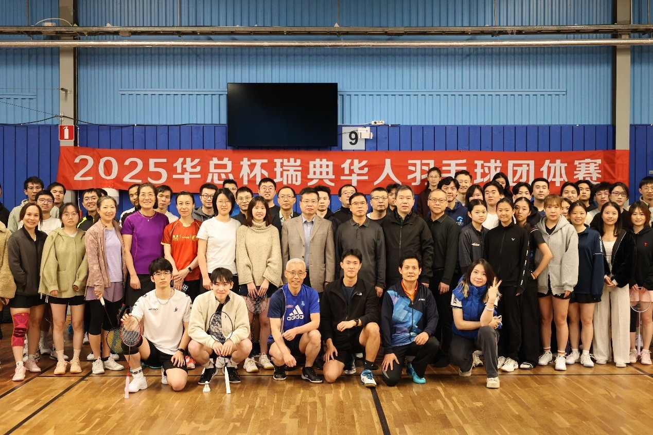 中國駐瑞典大使館臨時(shí)代辦萬德剛出席“華總杯”瑞典華人羽毛球團(tuán)體賽開幕式。中國駐瑞典大使館供圖