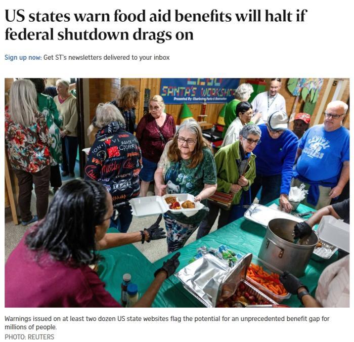 據(jù)美國廣播公司(ABC)報(bào)道稱,美國農(nóng)業(yè)部在一份通知中表示: “歸根結(jié)底,資金已經(jīng)枯竭。11月1日起將不會發(fā)放任何福利?!?/p>