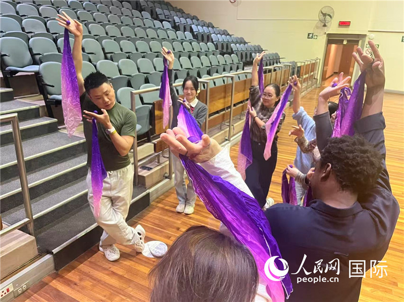 林晟昱老師在西開普大學中醫(yī)孔子學院向當?shù)貛熒鷤魇谘砀琛霸E竅”。人民網記者 鄒松攝