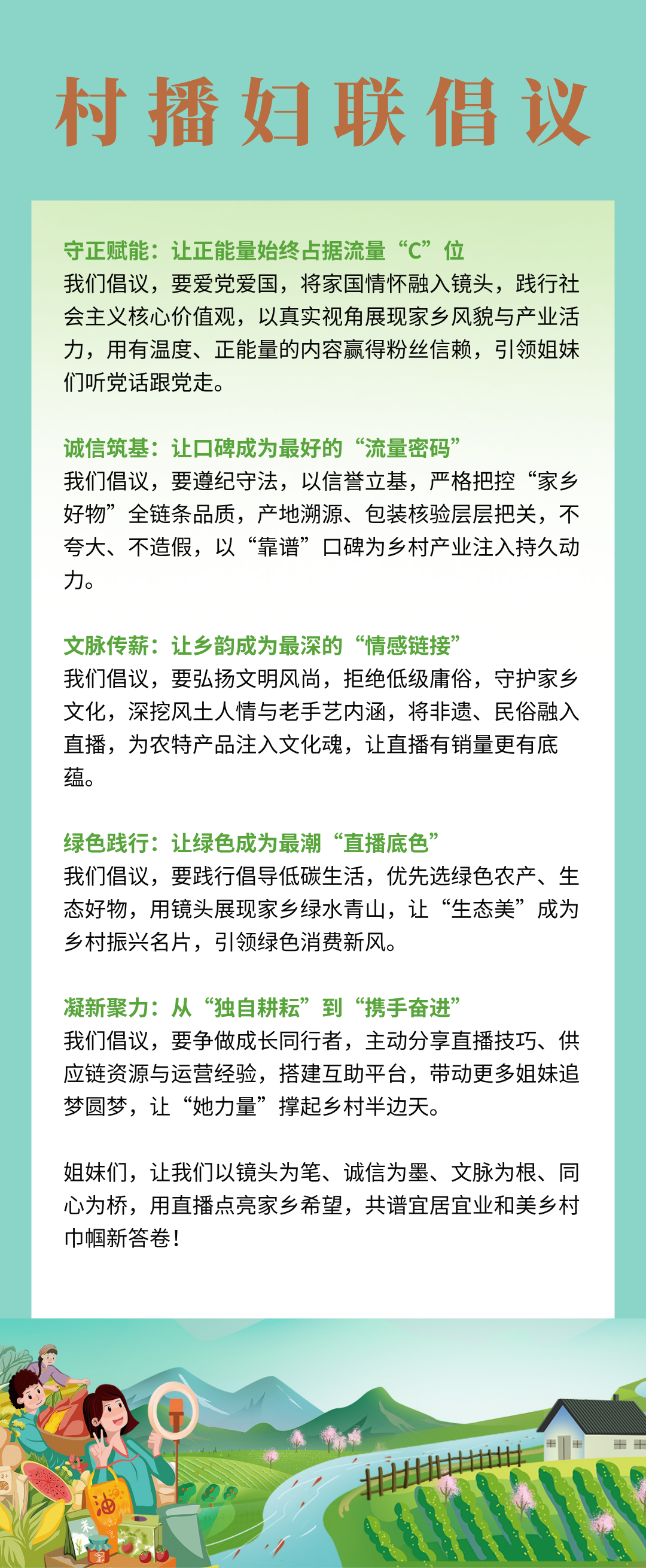 五位村播婦聯(lián)代表共同發(fā)出倡議,以“守正賦能”錨定方向、“誠信筑基”堅守底線、“文脈傳薪”延續(xù)根脈、“綠色踐行”繪就底色、“凝新聚力”共赴新程,號召全國的女主播們堅守初心使命,凝聚巾幗合力,用直播點亮家鄉(xiāng)希望,以實干擔當共譜和美鄉(xiāng)村巾幗新答卷。
