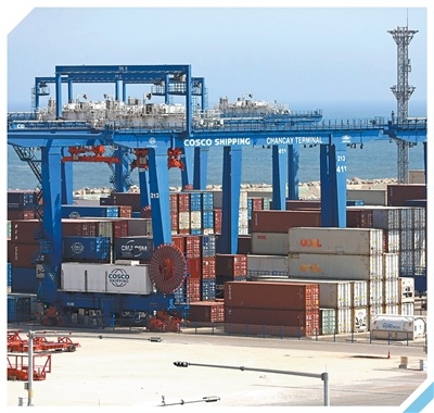 秘魯錢凱港碼頭擺放的集裝箱。