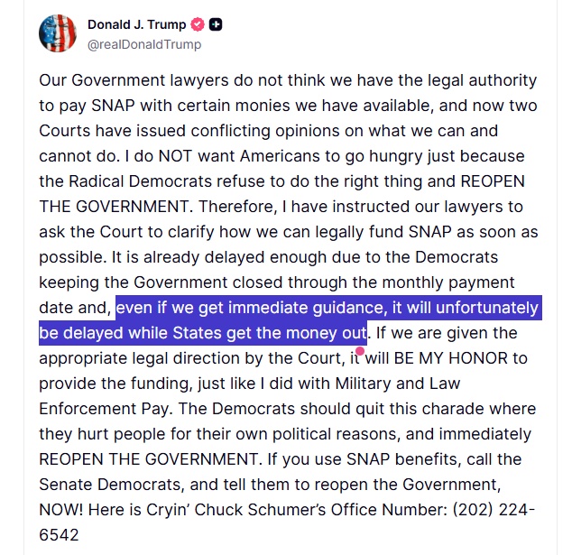 △當(dāng)?shù)貢r間10月31日,美國總統(tǒng)特朗普就“補(bǔ)充營養(yǎng)援助計劃”發(fā)表聲明。特朗普再次指責(zé)是民主黨導(dǎo)致政府“停擺”,最終招致美國民眾忍饑挨餓。