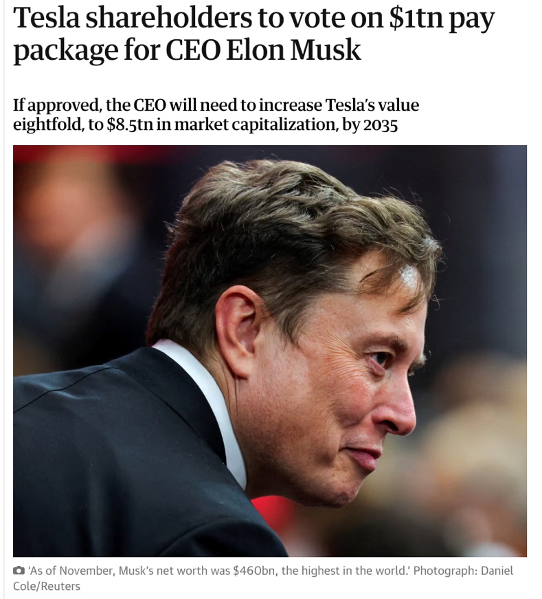 △《衛(wèi)報(bào)》報(bào)道,如馬斯克薪酬方案獲特斯拉股東大會(huì)批準(zhǔn),他將可能成為首位萬(wàn)億富翁
