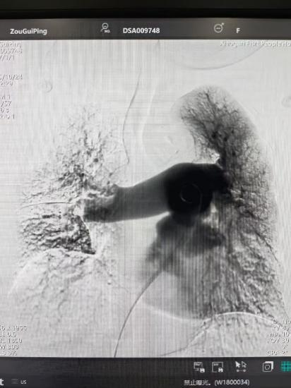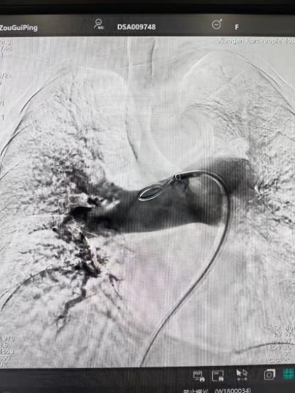 面對危急的病情,介入血管科團隊在黃遷祥的帶領(lǐng)下,對患者病情進行充分評估和綜合研判后,最終制定了 “肺動脈抽栓 + 局部溶栓藥物灌注 + 下腔靜脈濾器置入術(shù)” 的微創(chuàng)介入治療方案。