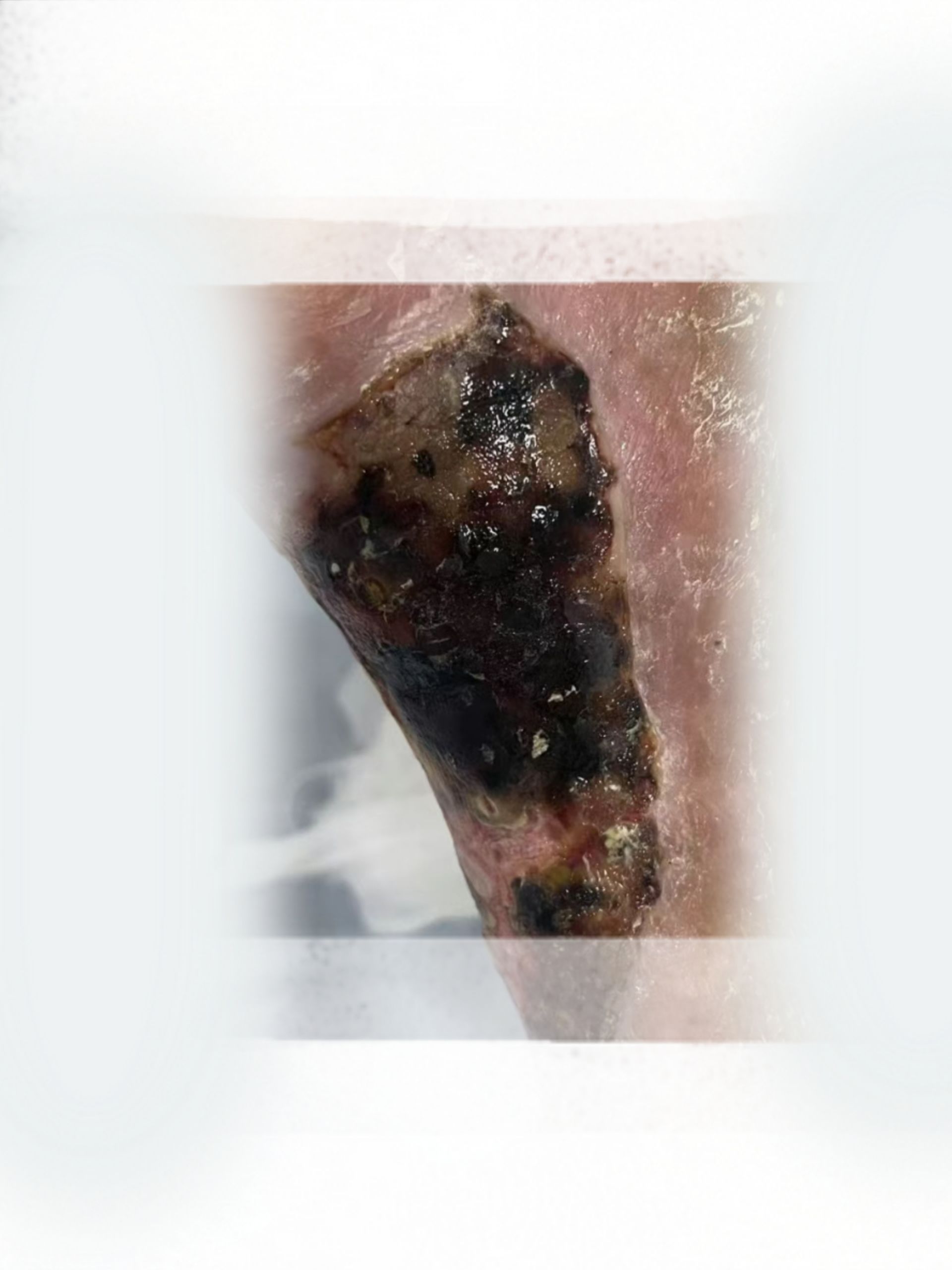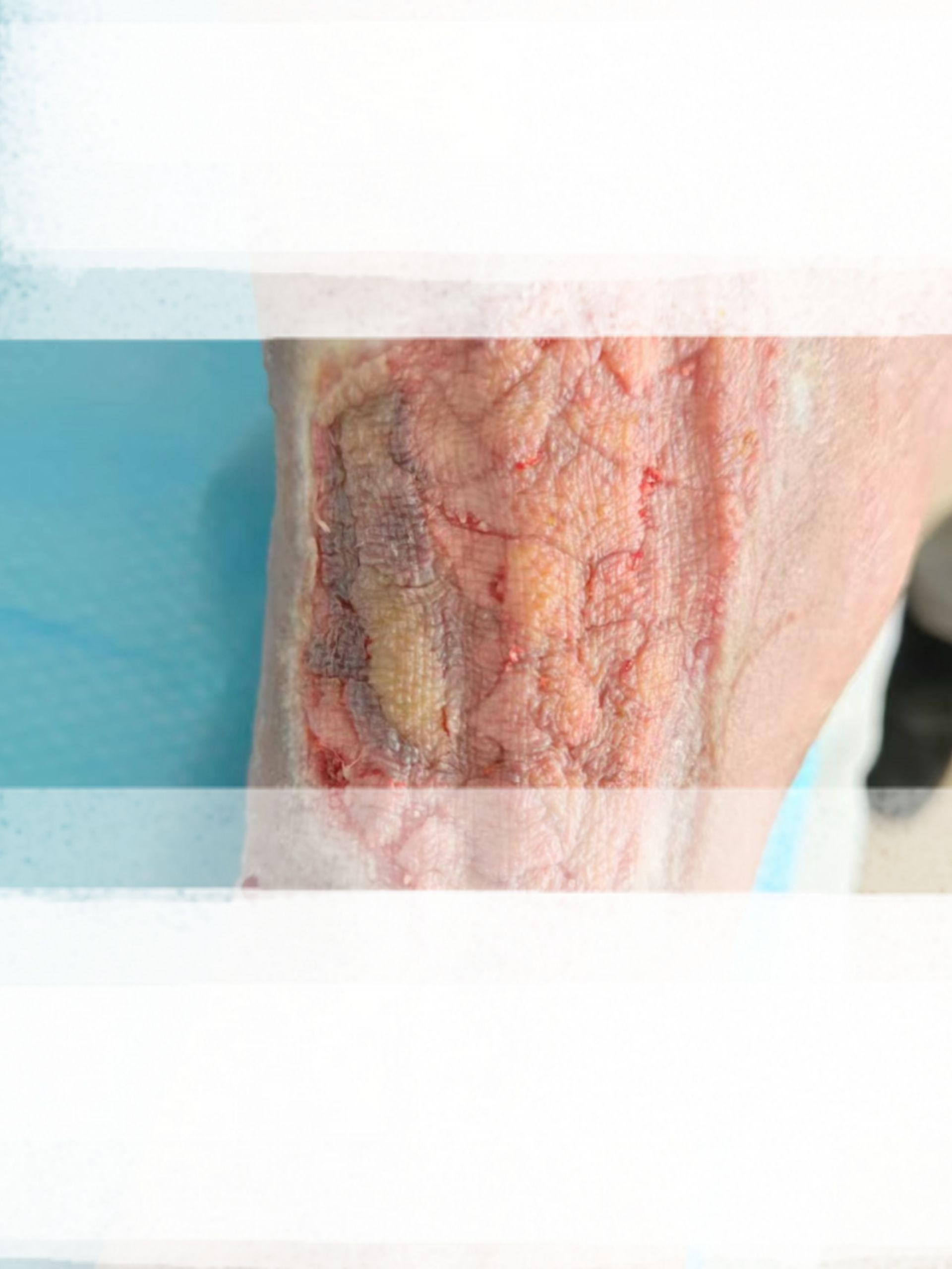 “您放心,既然信任我們,我們必定全力以赴!”接診的吳學群第一時間為老人開展檢查。檢查結(jié)果顯示:右小腿創(chuàng)面達10cm×8cm,深及肌層,跟腱明顯暴露;實驗室指標提示炎性指標顯著升高,D-二聚體異常增高,存在血栓形成風險。吳學群當即組建以王盛副主任醫(yī)師為核心,曾伯石、黃卓群主治醫(yī)師及陳麗珊醫(yī)師為骨干的專項治療小組,同時啟動多學科協(xié)作機制,為老人制定個體化救治方案。
