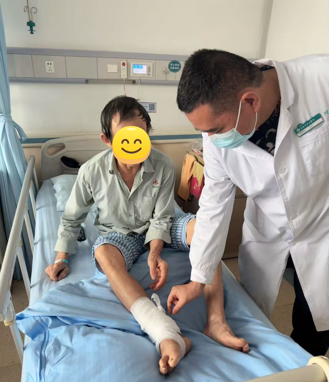 歷經(jīng)近一個月的精準治療與悉心照料,程大爺?shù)牟∏橛瓉碣|(zhì)的轉(zhuǎn)變:右下肢創(chuàng)面植皮完全成活,無紅腫、滲液,炎性指標恢復正常,血壓控制平穩(wěn),已能借助拐杖自主緩慢行走,生活逐步恢復自理。