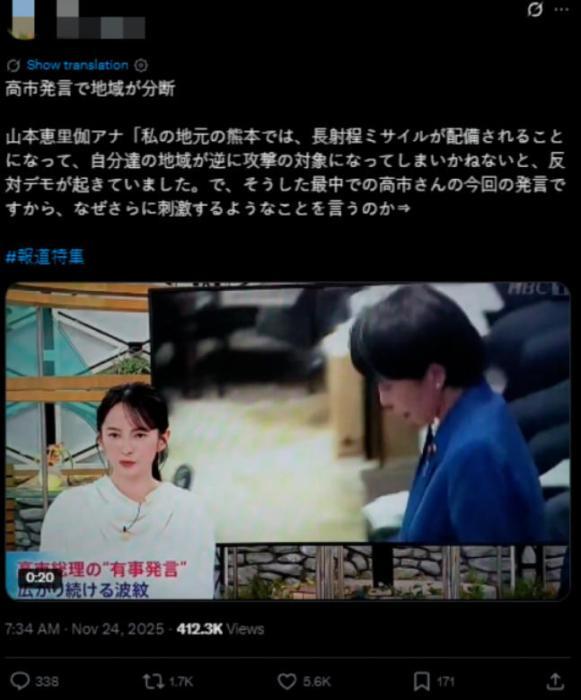 在社交媒體平臺上,一名網(wǎng)友援引日本主播的評論表示:“在我的家鄉(xiāng)熊本,由于(日本政府)決定部署長程導彈,當?shù)匾殉霈F(xiàn)抗議集會。在此風口浪尖,高市卻發(fā)表此番言論——(人們不禁質(zhì)疑)她為何要火上澆油?”